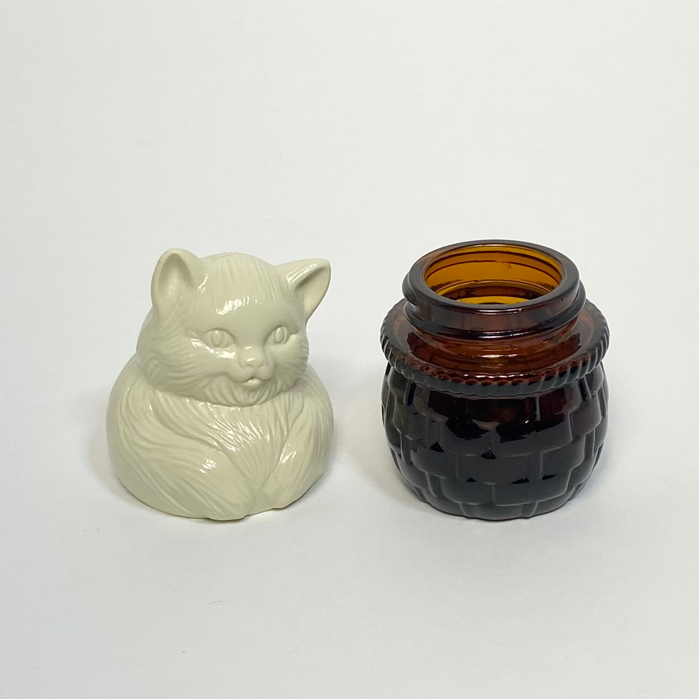 Avon - Beige Cat in Glass Basket Perfume Bottle 1974