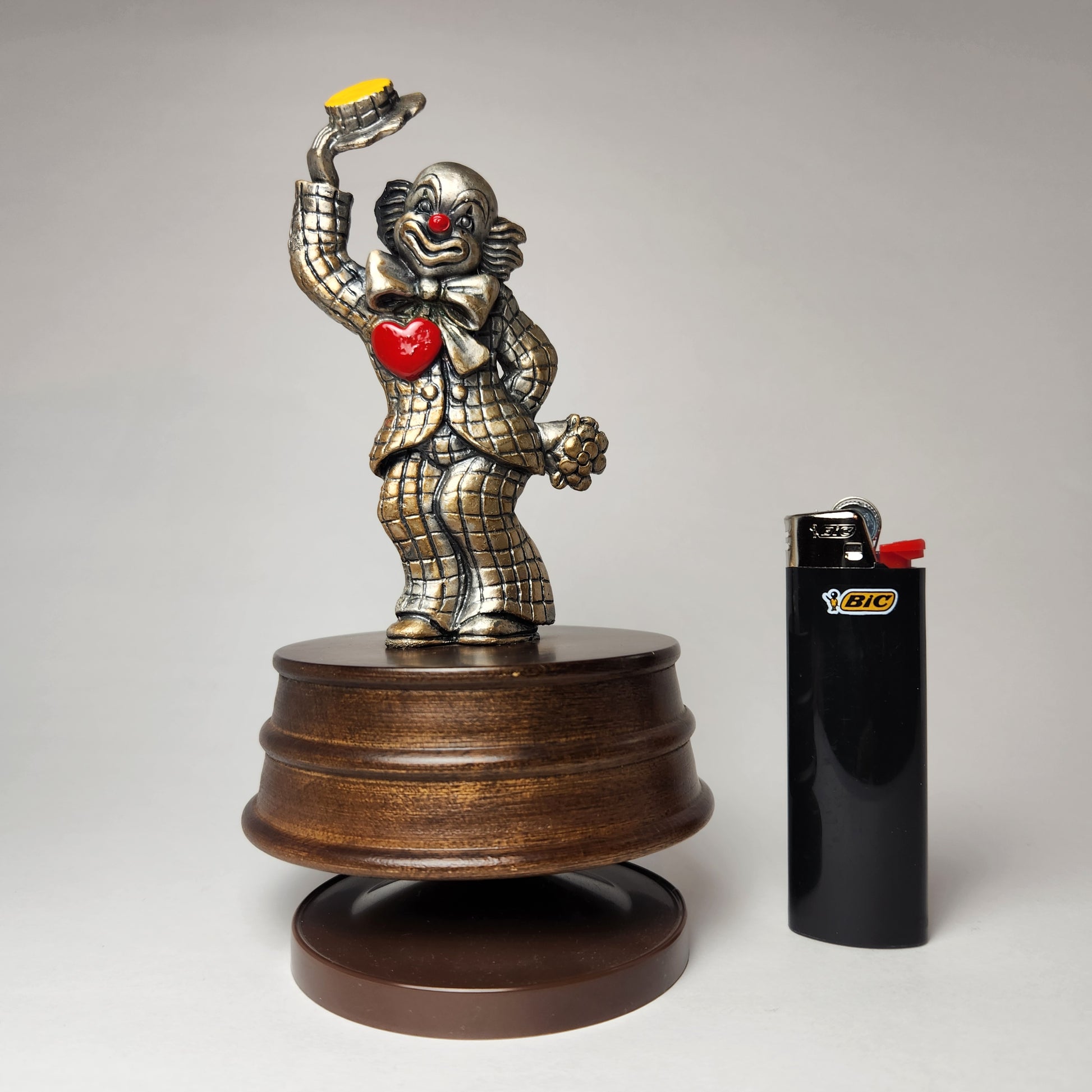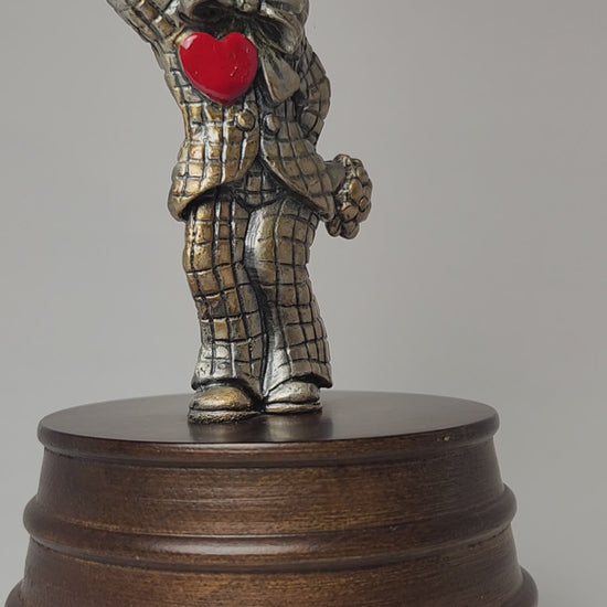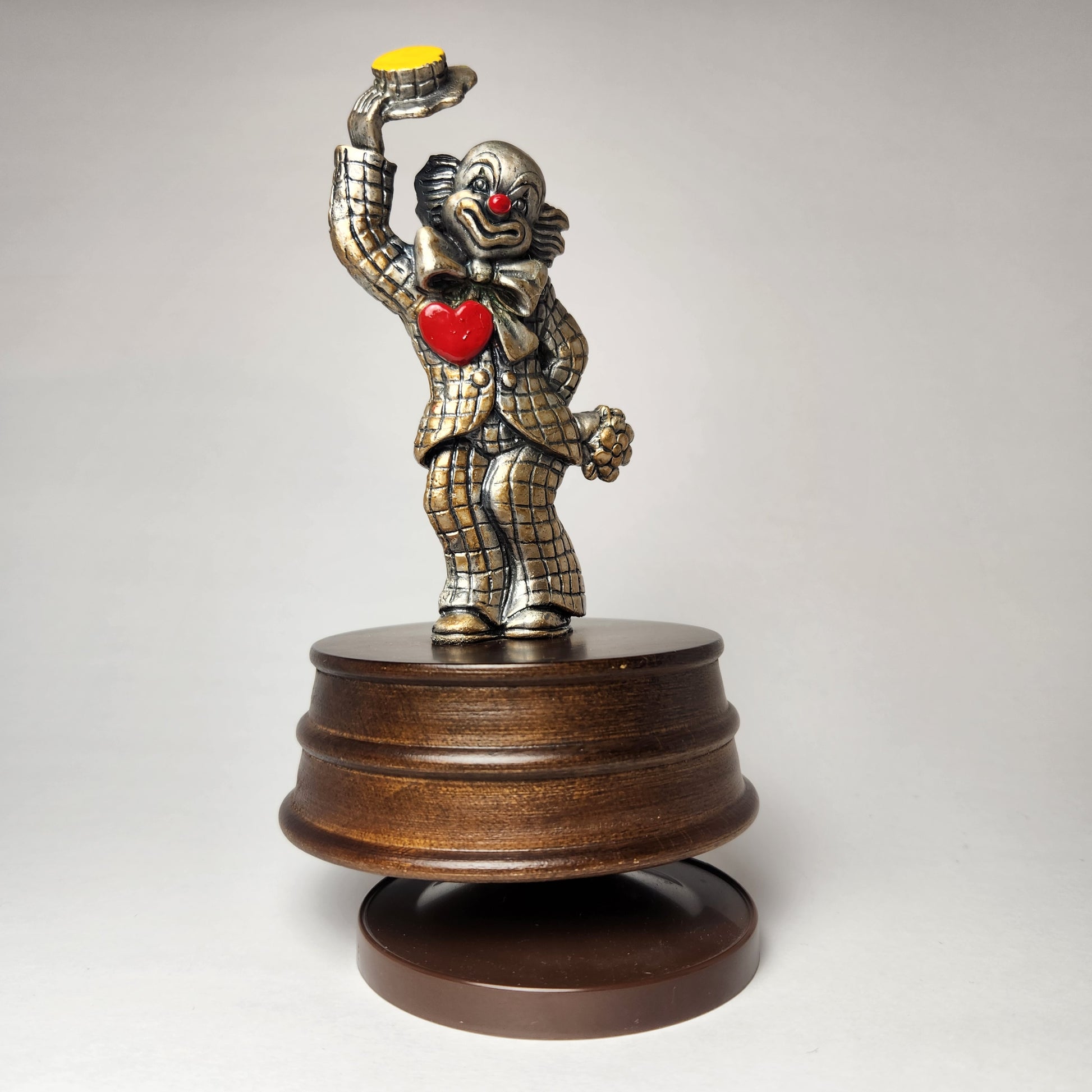 1980s Vintage Pewter Clown with Heart & Flowers Music Box